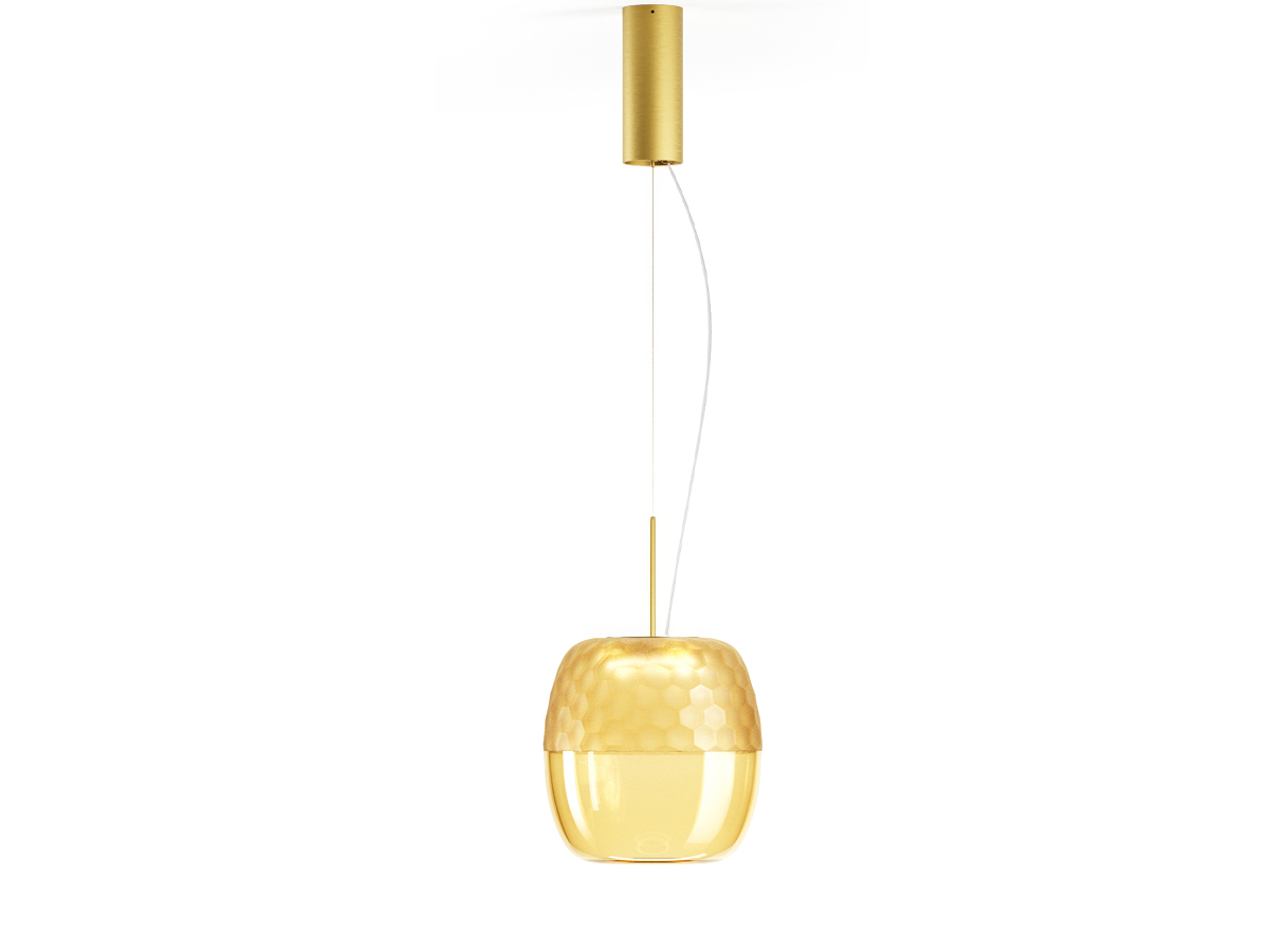 Feeding canopy with ceiling mounting bracket in pickled sheet metal and extruded aluminium housing with polyacrylic paint in mat black or mat brass finish.