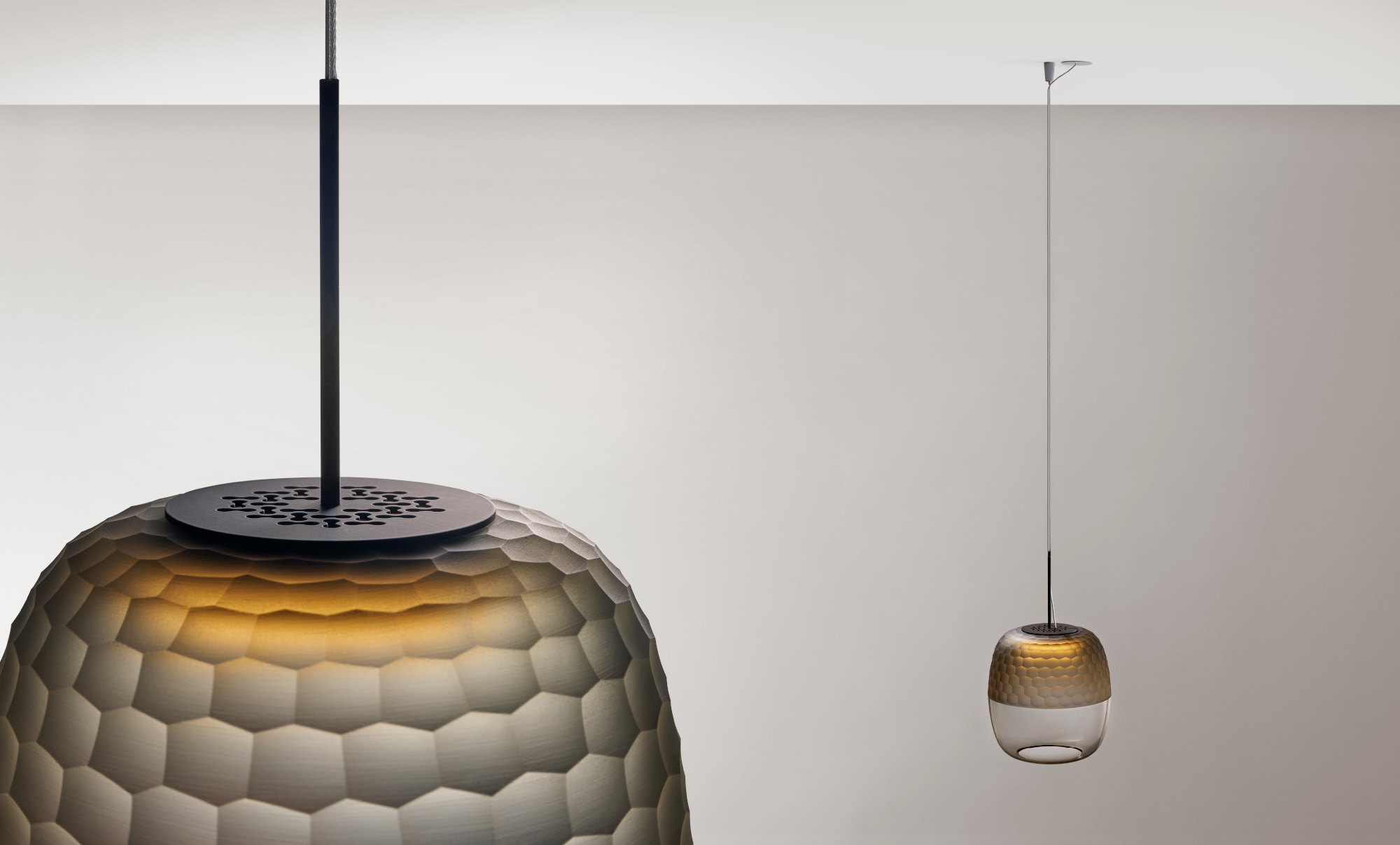 Feeding canopy with ceiling mounting bracket in pickled sheet metal and extruded aluminium housing with polyacrylic paint in mat black or mat brass finish.