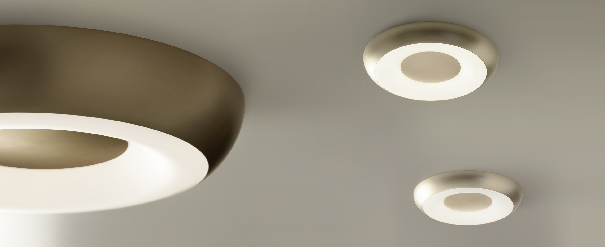 The Superbold collection is inspired by the simplicity of the circle, a precise sign that with its soft and timeless shapes dialogues with space in a discreet manner. The small footprint and the diffused light filtering through the opaque technopolymer ring allow it to furnish and illuminate different types of domestic and public environments from walls and ceilings. Superbold is available in two sizes in textured soft white, satin black, bronze, satin brass, textured myrtle blue, and textured natural terracotta finishes, which provide different visual and tactile effects, characterising the space in which they are inserted. DALI/Push DIM available on request.